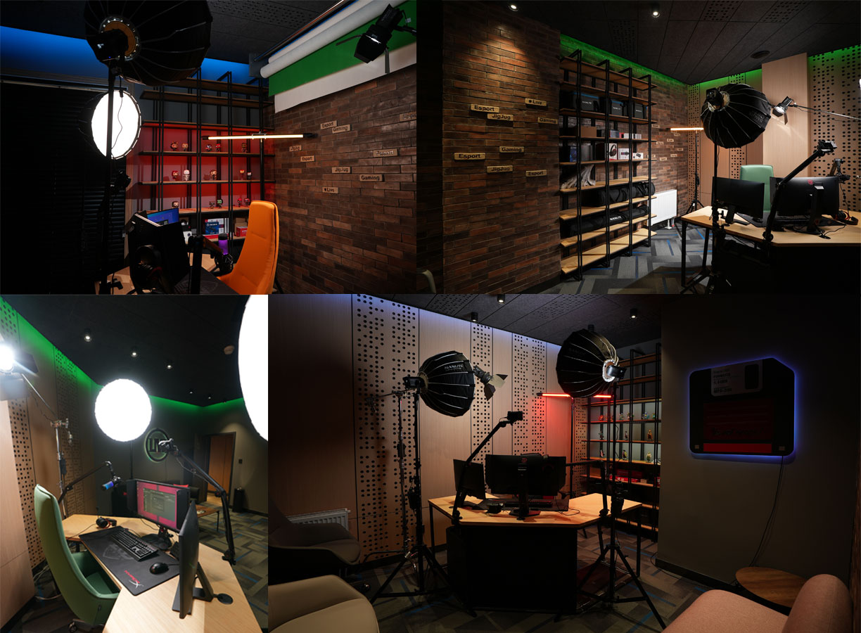 Өрөө тус бүр дуу тусгаарлагч хана өндөр хурдны интернет, backdrop-ыг шийдэж өгсөн ба хамгийн сүүлийн үеийн үзүүлэлт бүхий PC set-үүд байршуулсан нь хэрэглэгч өөрийн хүссэн контентоо хийх бүрэн боломжтой юм.